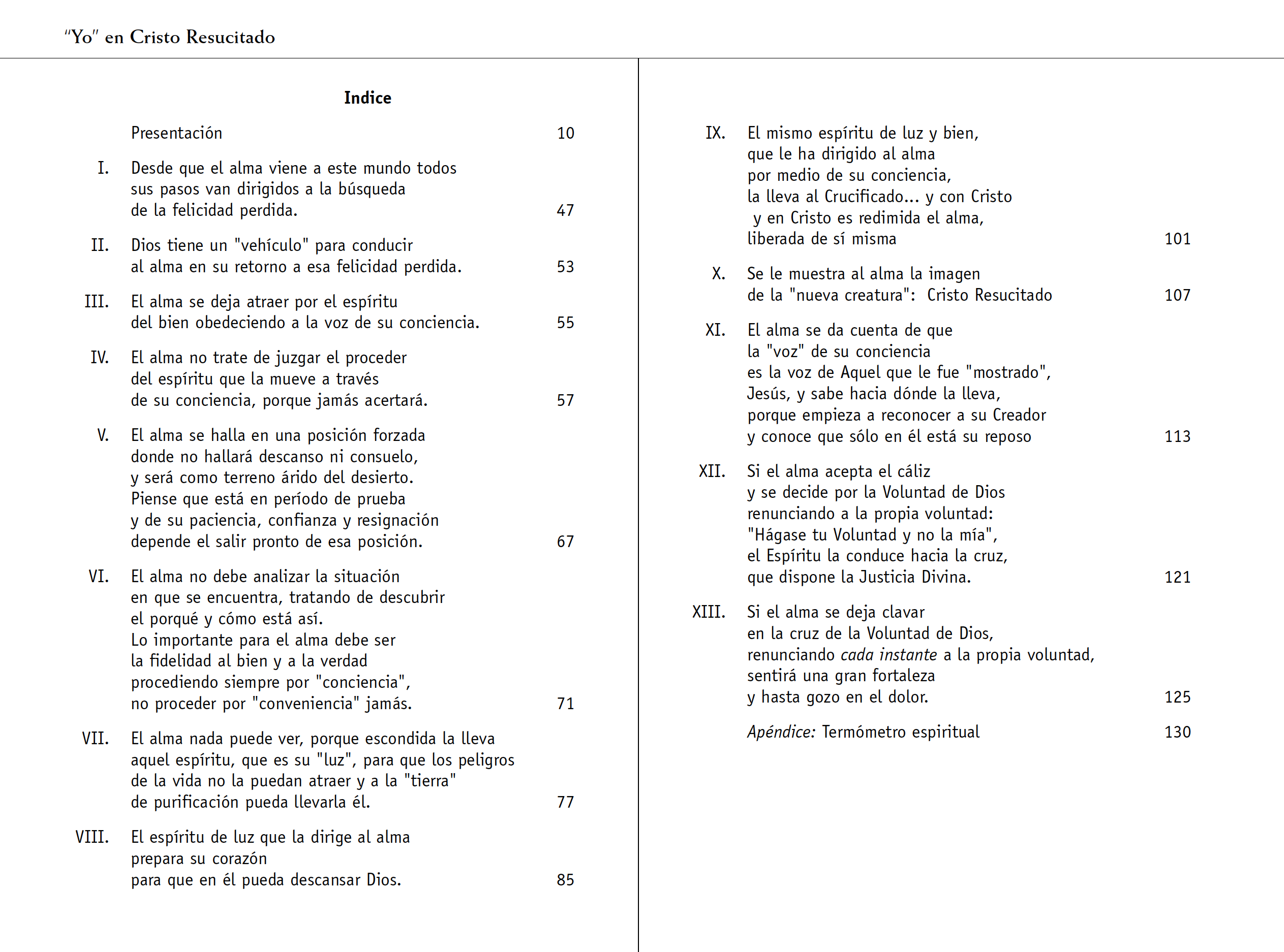 “Yo” en Cristo Resucitado pretende describir el proceso de liberación del hombre, centrando la atención en su carácter individual. Sin embargo, no deja de transparentarse la amplitud de la intención puesta en el proceso de liberación de la humanidad vista en la dimensión de la persona. La forma de exposición es corriente en los escritos de este carácter. El contenido es resumido primero en pequeñas composiciones, cortadas en forma de estrofas, en número de trece, a las cuales acompaña una explicación. El camino de la vida espiritual es tomado desde que se inicia con la aparición de un hombre en la tierra y proseguido hasta la UNION definitiva, que en el lenguaje propio del libro,es designada como: “Entrada en Cristo”. La llegada a esta meta es precedida de la gradual liberación del pecado hasta su total desaparición, acompañada de una progresiva participación del Espíritu de Jesús en la medida para cada uno señalada por la justicia de Dios. En el desarrollo del proceso son notadas las principales características de los pasos y peligros de cada una de las etapas por las que va atravesando el alma en su camino de vuelta a la recuperación de la felicidad perdida e igualmente son señalados los obstáculos que pueden paralizar la marcha.